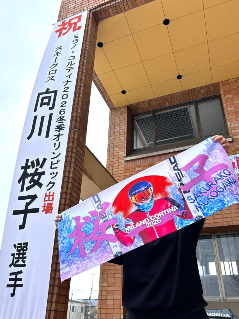 令和8年2月20日(金曜日)午後5時55分から横手市生涯学習館Ao-na(あおーな)1階にて開催される、ミラノ・コルティナ2026冬季オリンピック『スキークロス(女子)』のパブリックビューイングで向川桜子選手オリジナルのスペシャルタオルを配布いたします🎿🌸✨